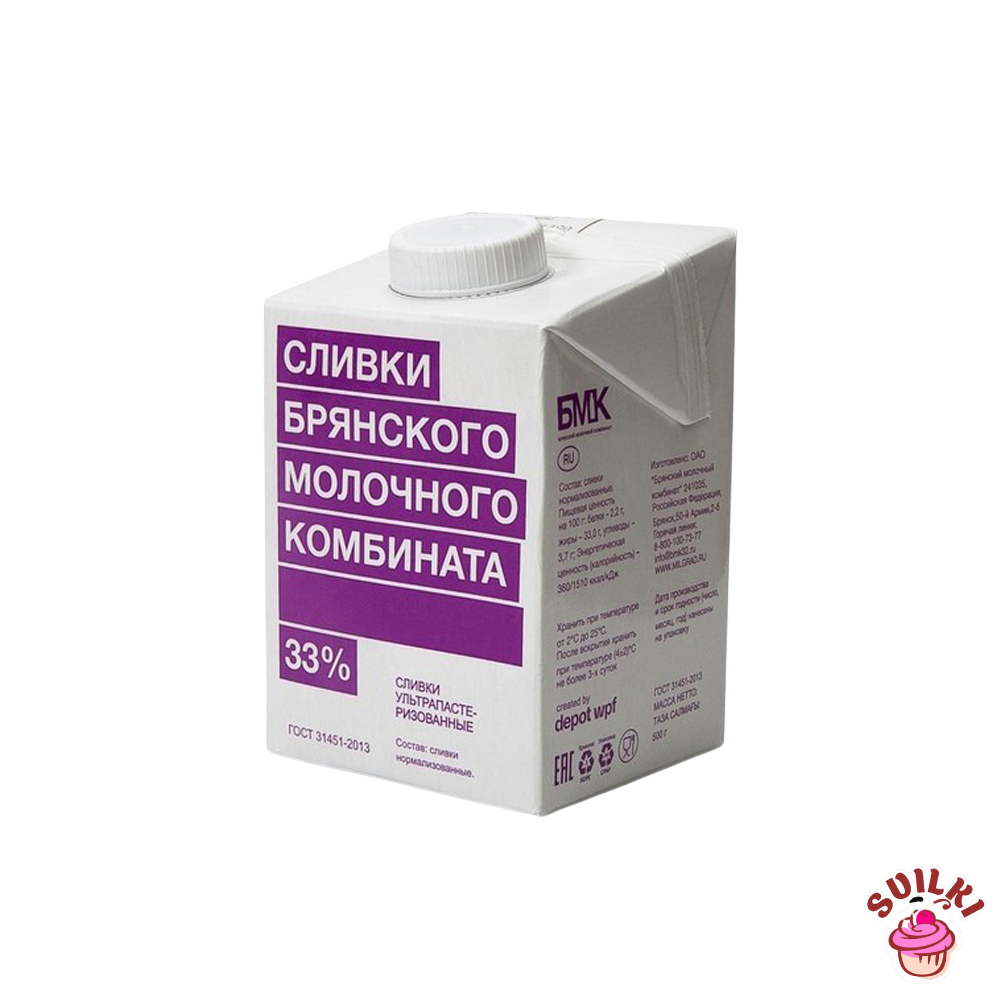 Сливки БМК 500 гр — сливки для взбивания ультрапастеризованные с массовой долей жира 33%, ГОСТ 31451.